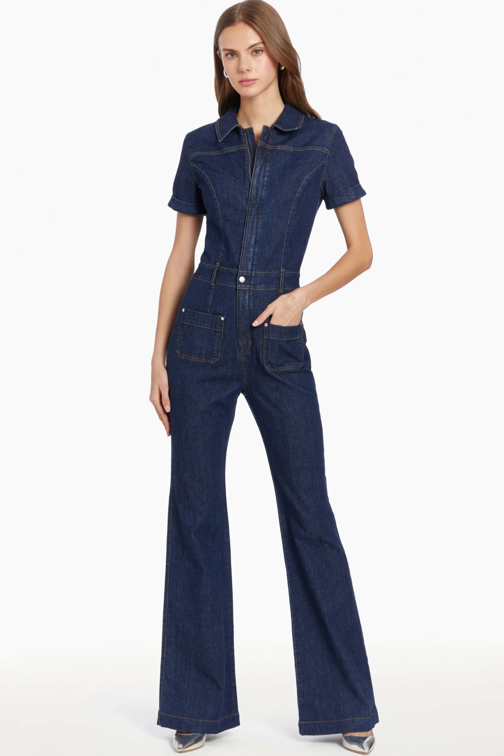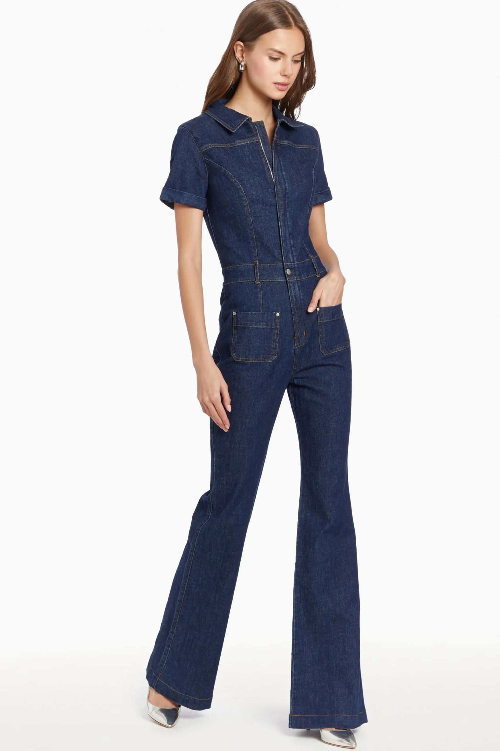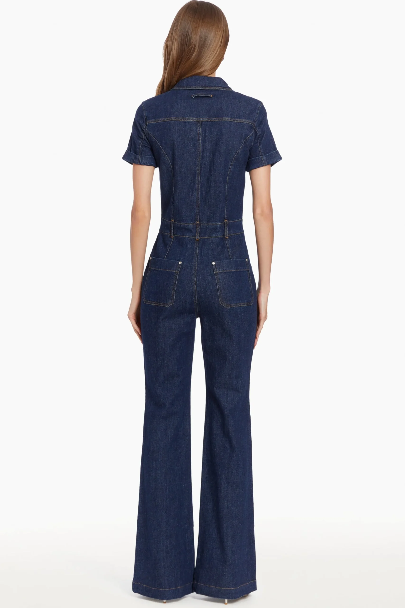 Catch eyes in the form-flattering Alexia Jumpsuit, a fresh take on denim. This short sleeve jumpsuit features a concealed zipper and metal snap closure at the waistband, offering a sleek silhouette. The slightly flared pant legs and patch pockets add a touch of retro feel, while the intricate topstitching details along the placket, seams, and hem combine utilitarian influences with a feminine look. Requiring minimal styling, the Alexia Jumpsuit is perfect for those days when you want to swap out your everyday jeans for something more exciting.