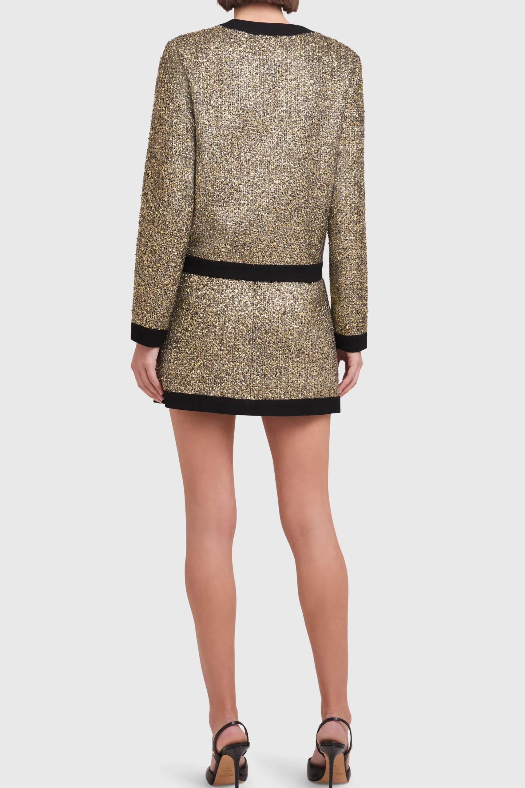 Light up the room in the Paxton Jacket, a bold piece that’s ideal for celebrating. The black outline on this gold, classically cut jacket adds just the right amount of edge. Charming pocket flaps and elevated gold buttons complete the luxurious piece. Pair with gold and black accessories and wear with the Paxton Skirt for a coordinated, timeless look.