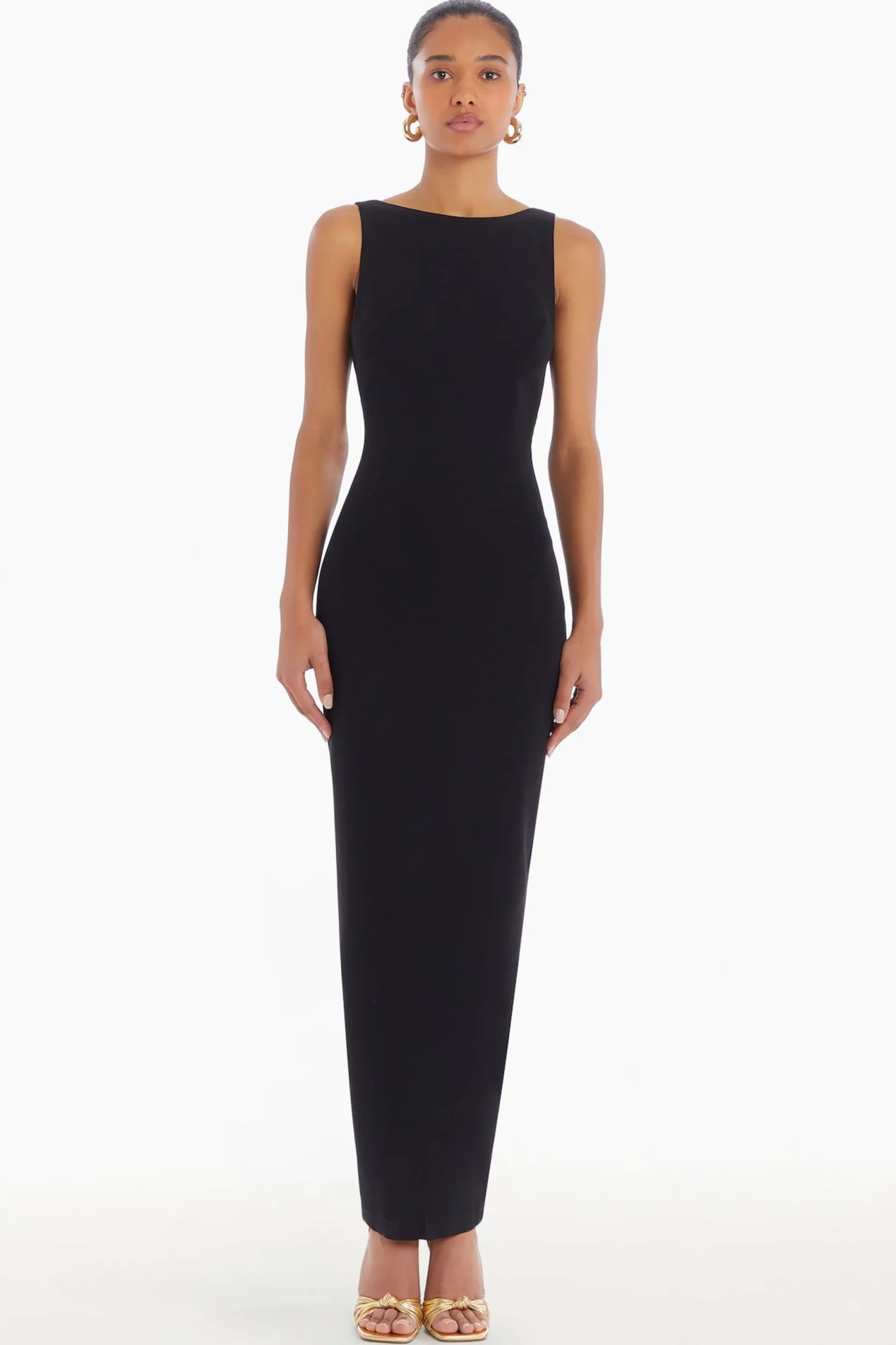 Make a statement with the Marbella Maxi Dress, where elegance meets bold sophistication. This high-neck column dress features fish-eye darts at the center front and back, shaping a flawless silhouette. The low scooped back adds a touch of allure, while the center back slit allows for graceful movement. Finished with an invisible zipper at the left side seam and lined in poly stretch.