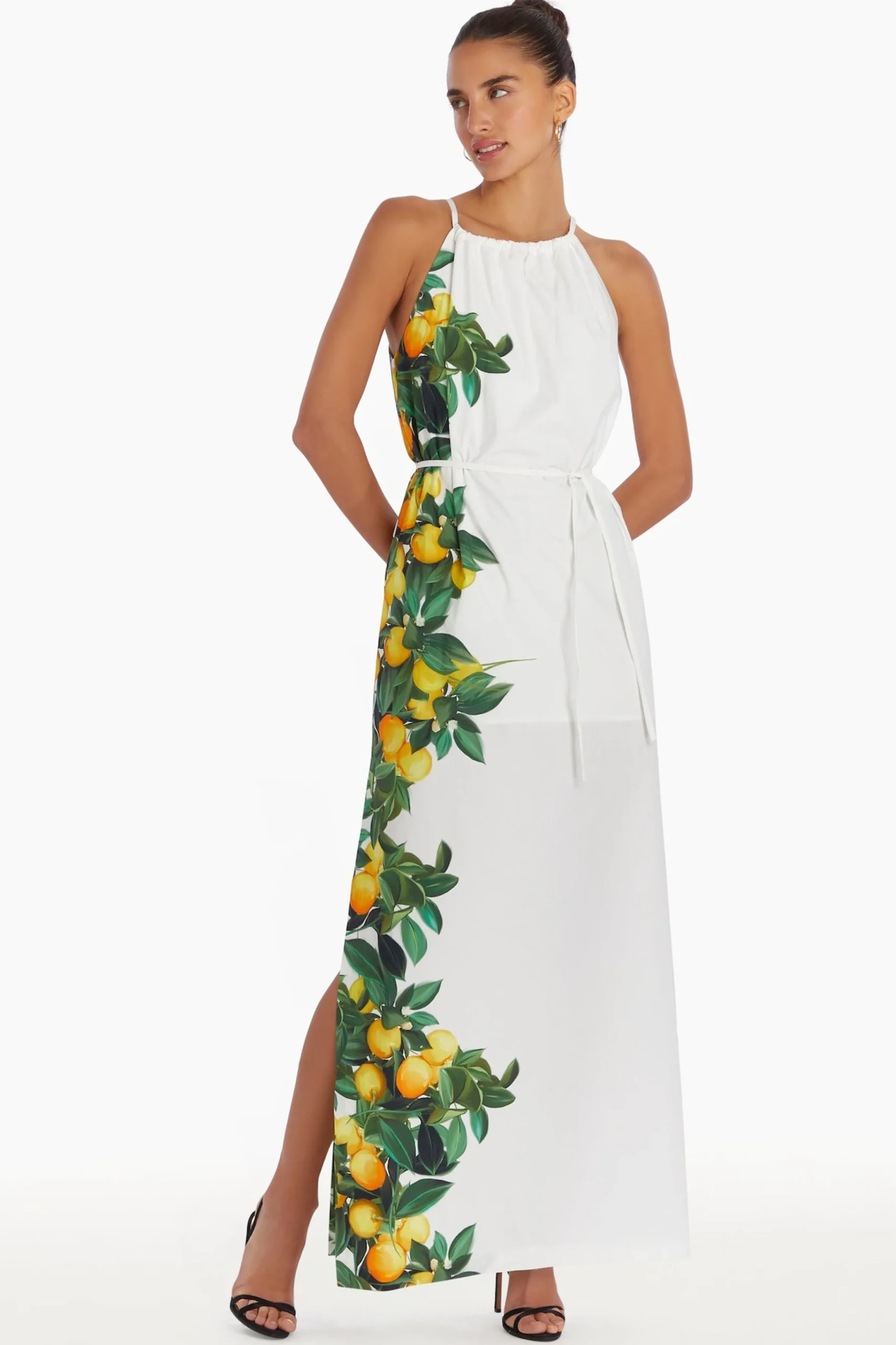 When life gives you lemons, you put on the Alicanta Dress. Crafted from breezy cotton poplin, this high neck maxi dress features a gathered front neckline and delicate spaghetti straps, ideal for showcasing sun-kissed shoulders. With slits at each side seam and a self-tie belt at the waist, it offers a flattering silhouette with a cinched waist, perfect for effortless summer chic.