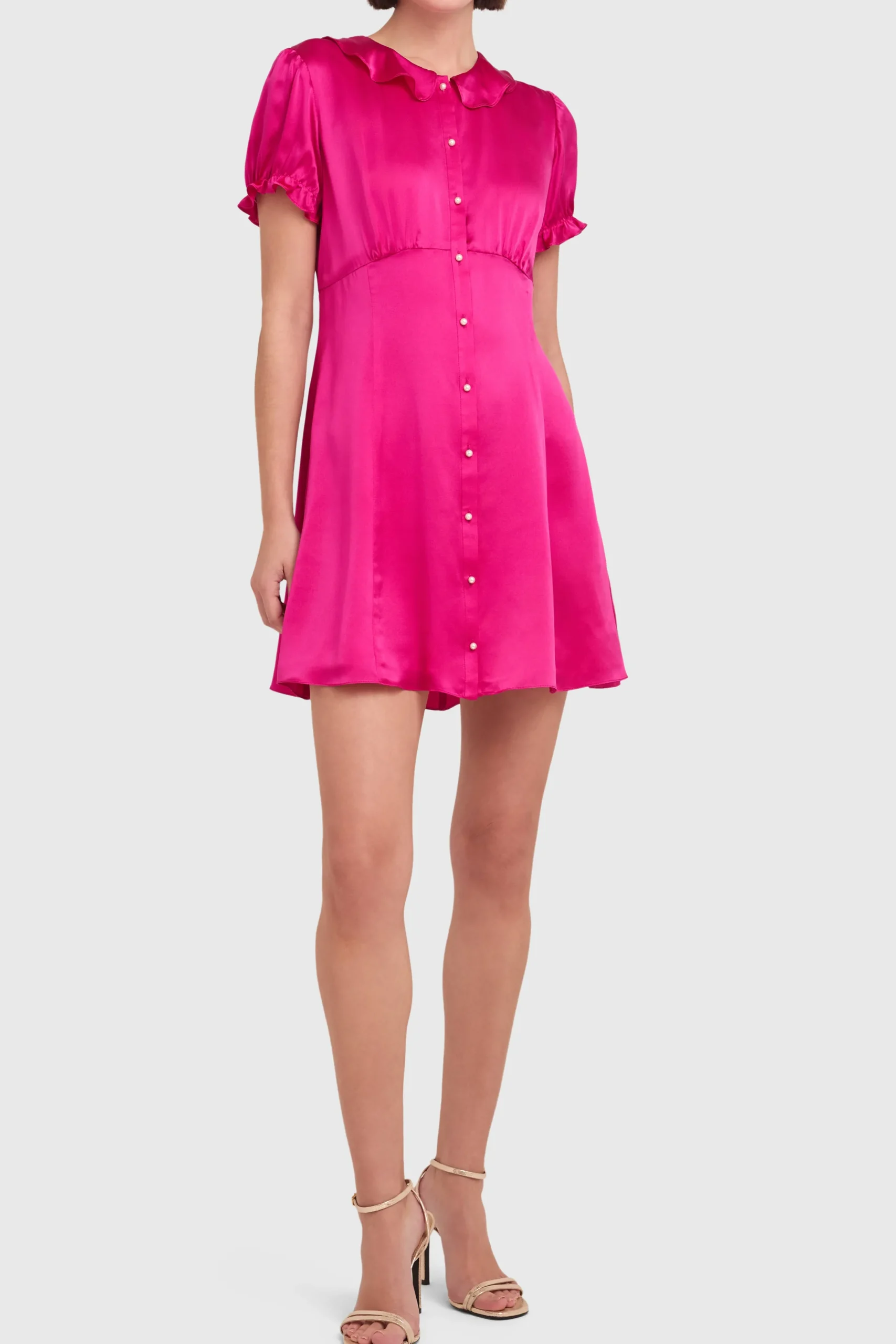 Stay sweet in the Gimaldi Mini. Crafted from recycled silk, this dress features flattering princess seams and cute button details down the front. With a playful collar and puffed sleeves, this mini is all about easy, feminine charm. Complete the look with tights and your favorite fall boots.