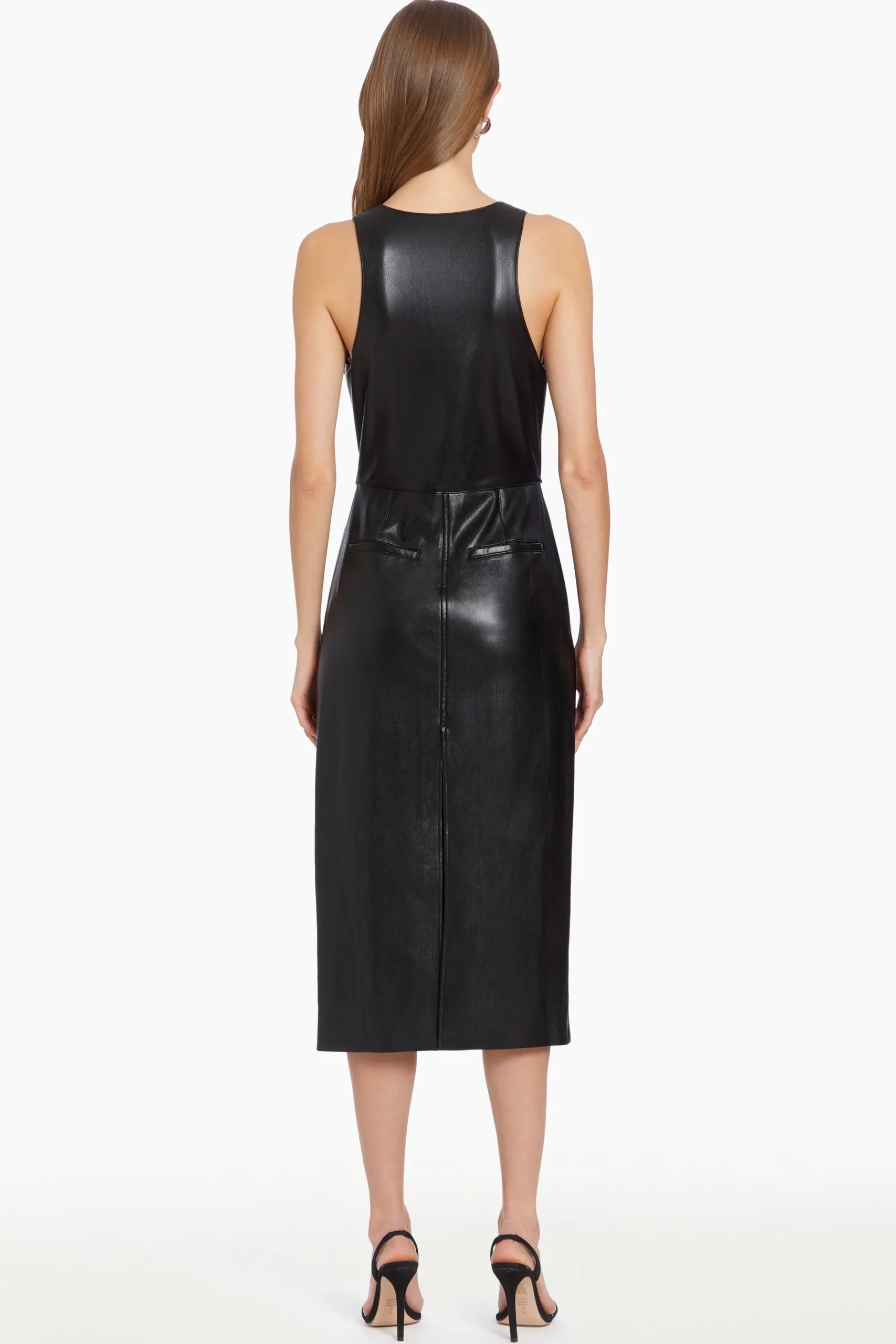 Stand out in the Ethan Dress, a mid-length leather piece designed to make a bold impression. The sleeveless v-neck cut and button closure down the front add sleek, structured detail to the leather piece. Style it with ankle boots and a cropped jacket to create a look that commands attention.