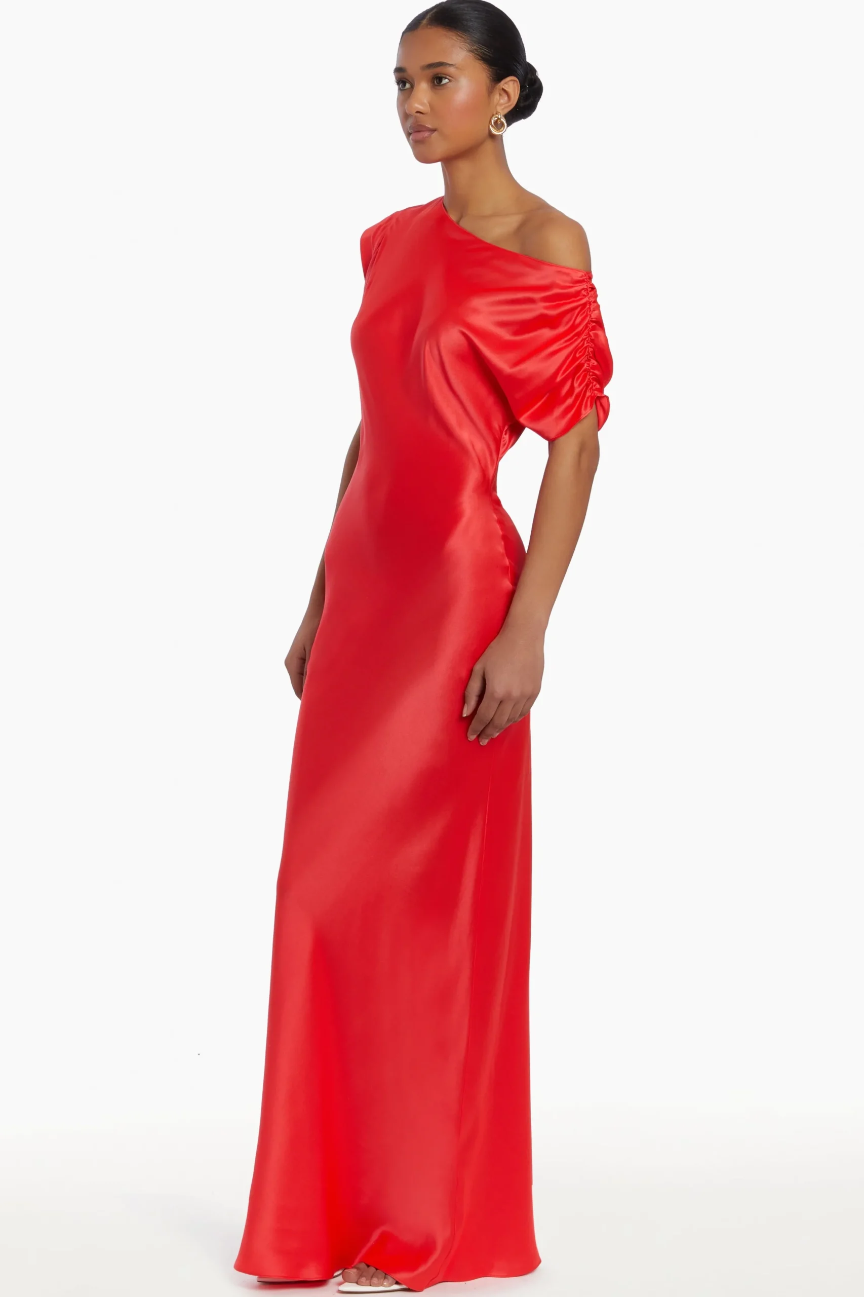 Turn heads in The Elroy Silk Maxi, an easy choice for your fall special occasions. This off-the-shoulder bias cut piece is delicately gathered at the shoulder, adding a romantic touch. Finished with a refined baby hem, this piece is the perfect blend of elegance and contemporary charm.