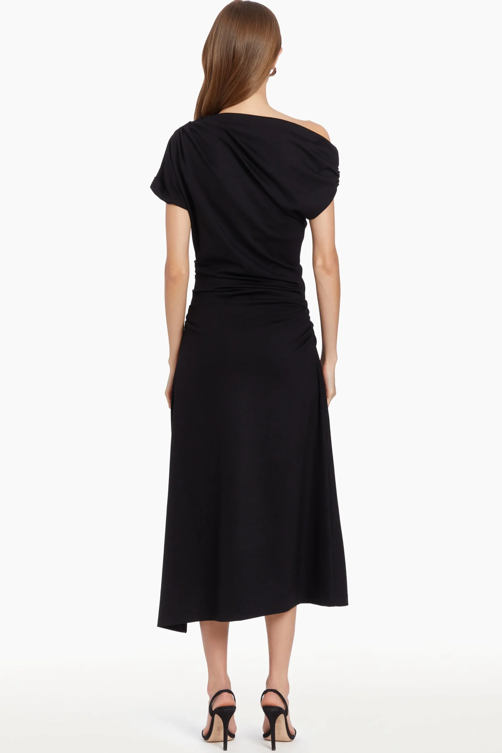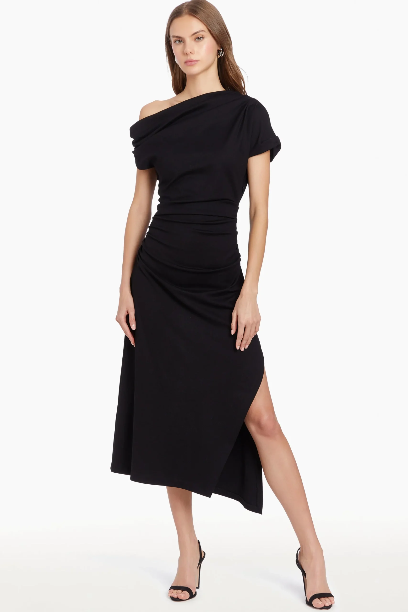 Embrace effortless elegance with The Columba Dress. This off-the-shoulder midi dress features flattering ruching at the shoulders and waist, creating a beautiful, sculpted silhouette. A chic slit at the center front adds a hint of allure, while the invisible zipper at the side seam ensures a seamless look. Ideal for those moments when you want to make a sophisticated yet striking impression.