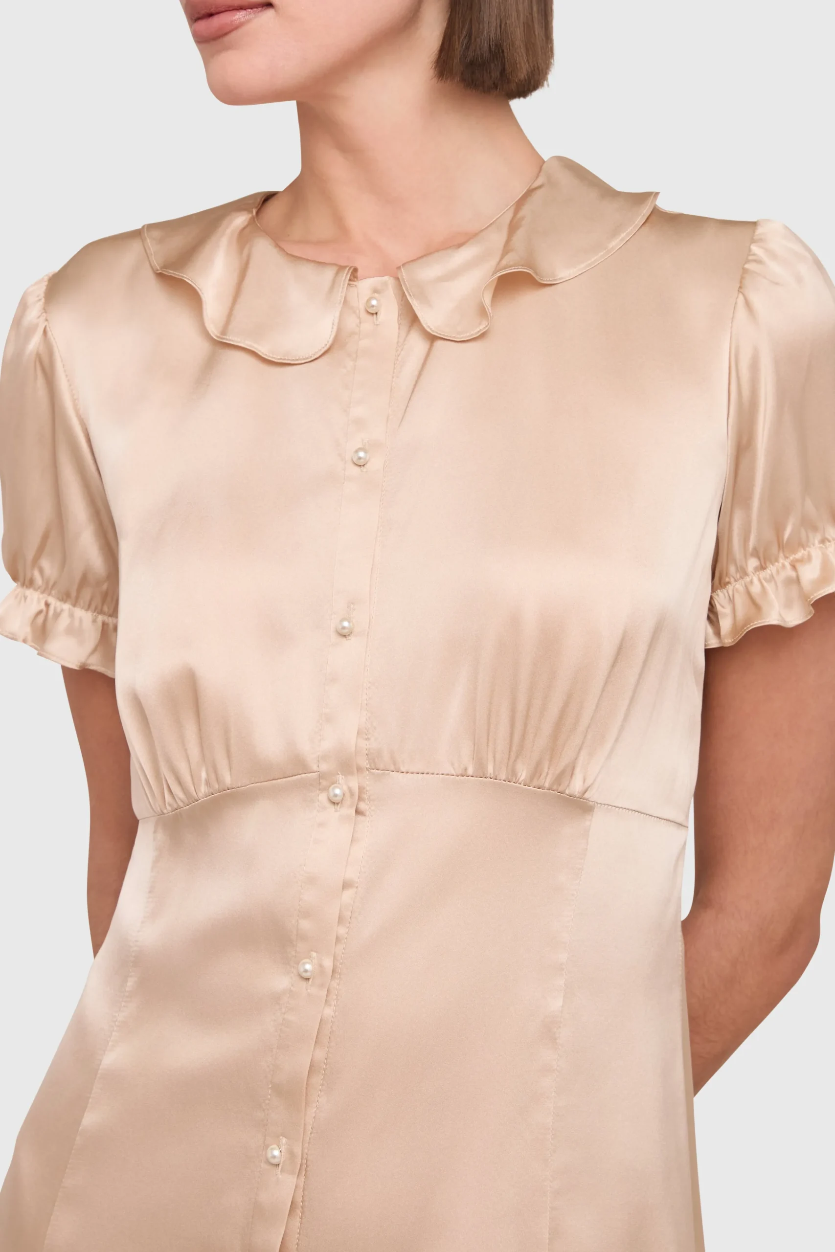 Stay sweet in the Gimaldi Mini. Crafted from recycled silk, this dress features flattering princess seams and cute button details down the front. With a playful collar and puffed sleeves, this mini is all about easy, feminine charm. Complete the look with tights and your favorite fall boots.
