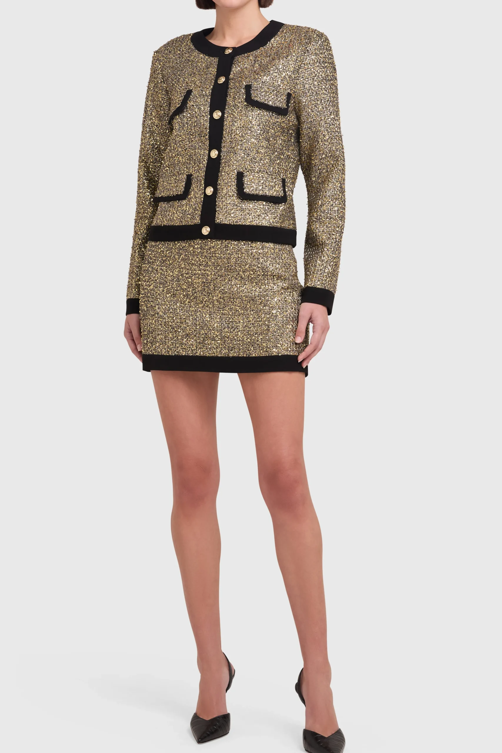 Light up the room in the Paxton Jacket, a bold piece that’s ideal for celebrating. The black outline on this gold, classically cut jacket adds just the right amount of edge. Charming pocket flaps and elevated gold buttons complete the luxurious piece. Pair with gold and black accessories and wear with the Paxton Skirt for a coordinated, timeless look.
