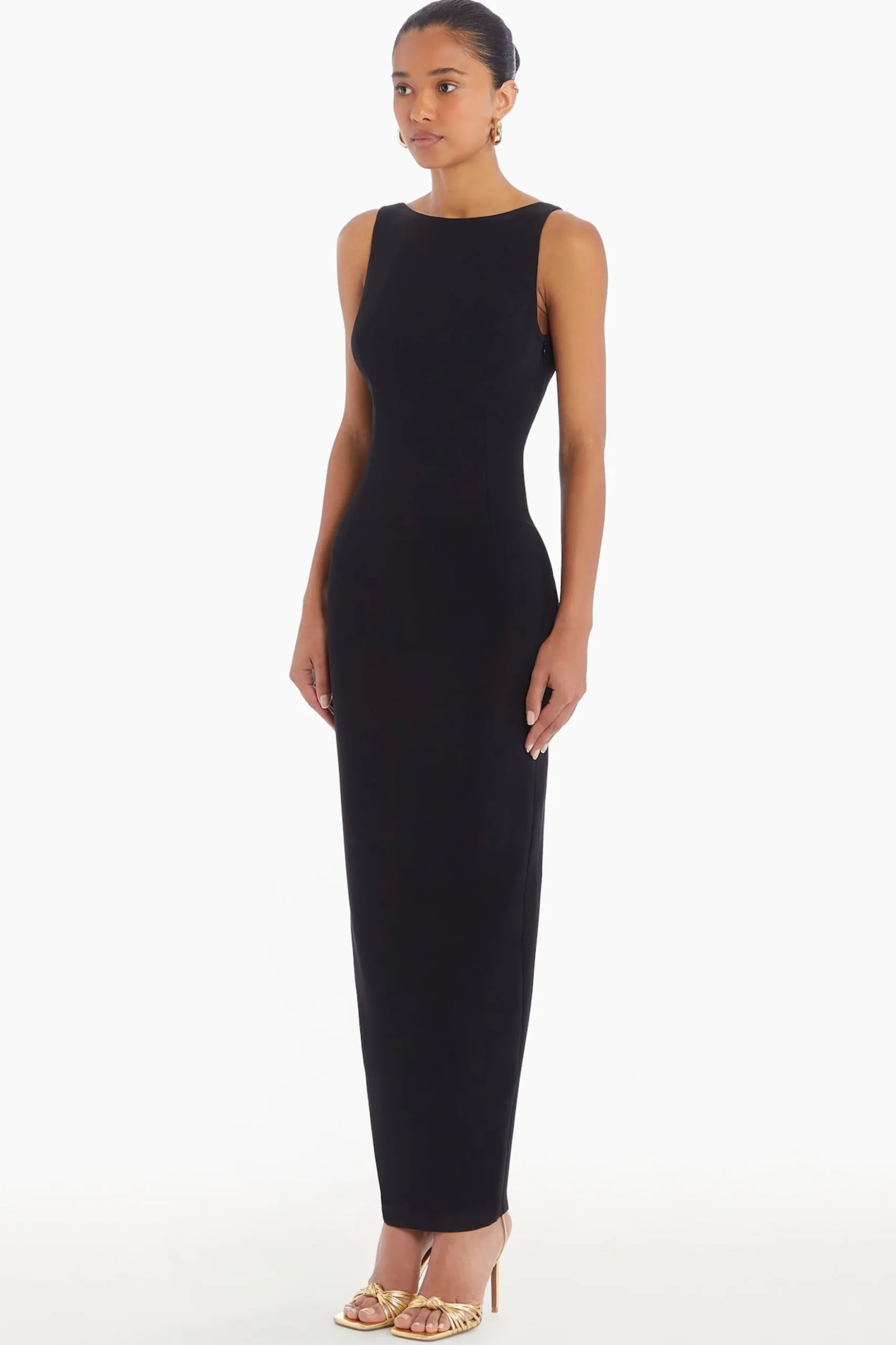 Make a statement with the Marbella Maxi Dress, where elegance meets bold sophistication. This high-neck column dress features fish-eye darts at the center front and back, shaping a flawless silhouette. The low scooped back adds a touch of allure, while the center back slit allows for graceful movement. Finished with an invisible zipper at the left side seam and lined in poly stretch.