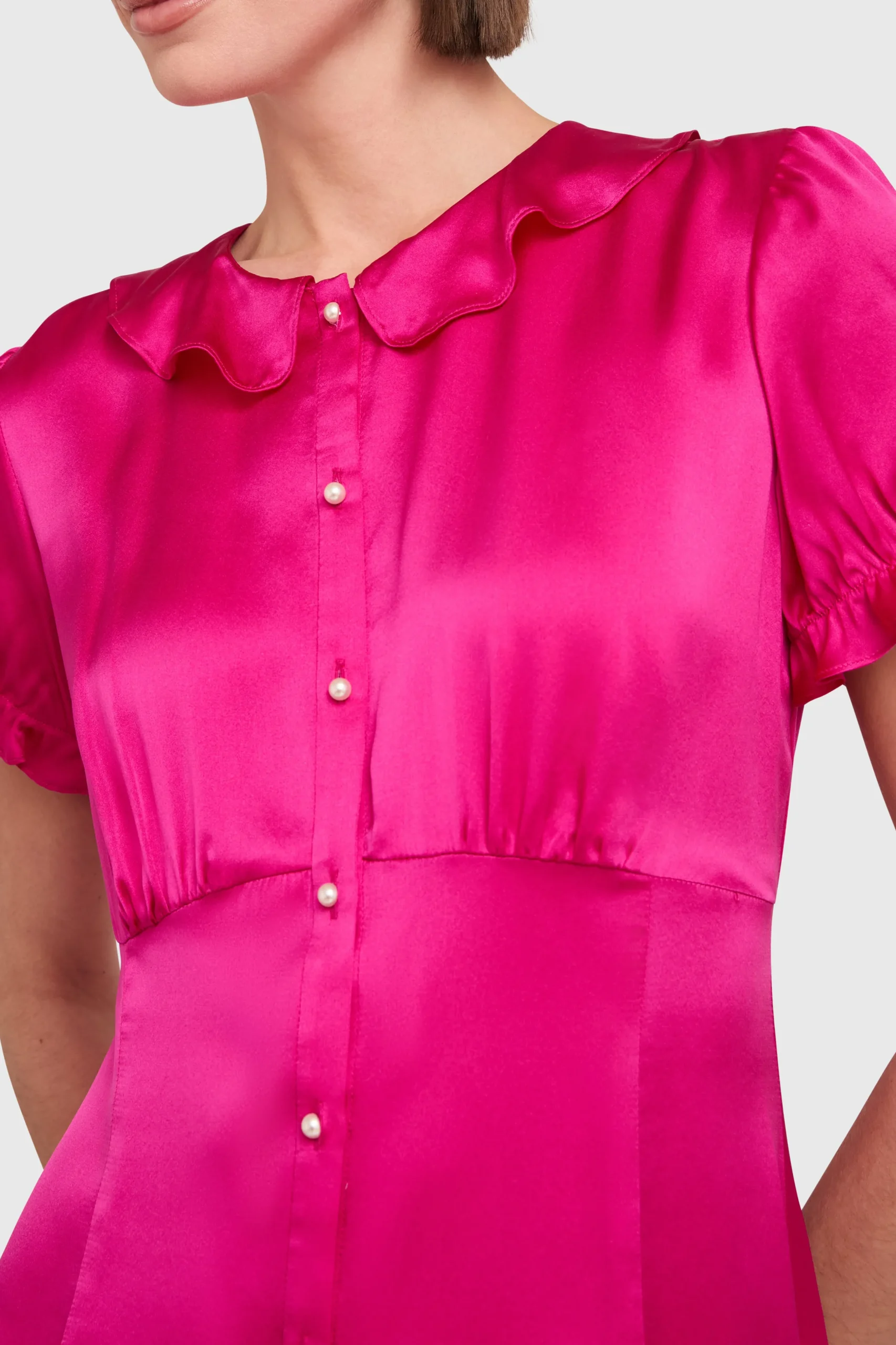 Stay sweet in the Gimaldi Mini. Crafted from recycled silk, this dress features flattering princess seams and cute button details down the front. With a playful collar and puffed sleeves, this mini is all about easy, feminine charm. Complete the look with tights and your favorite fall boots.
