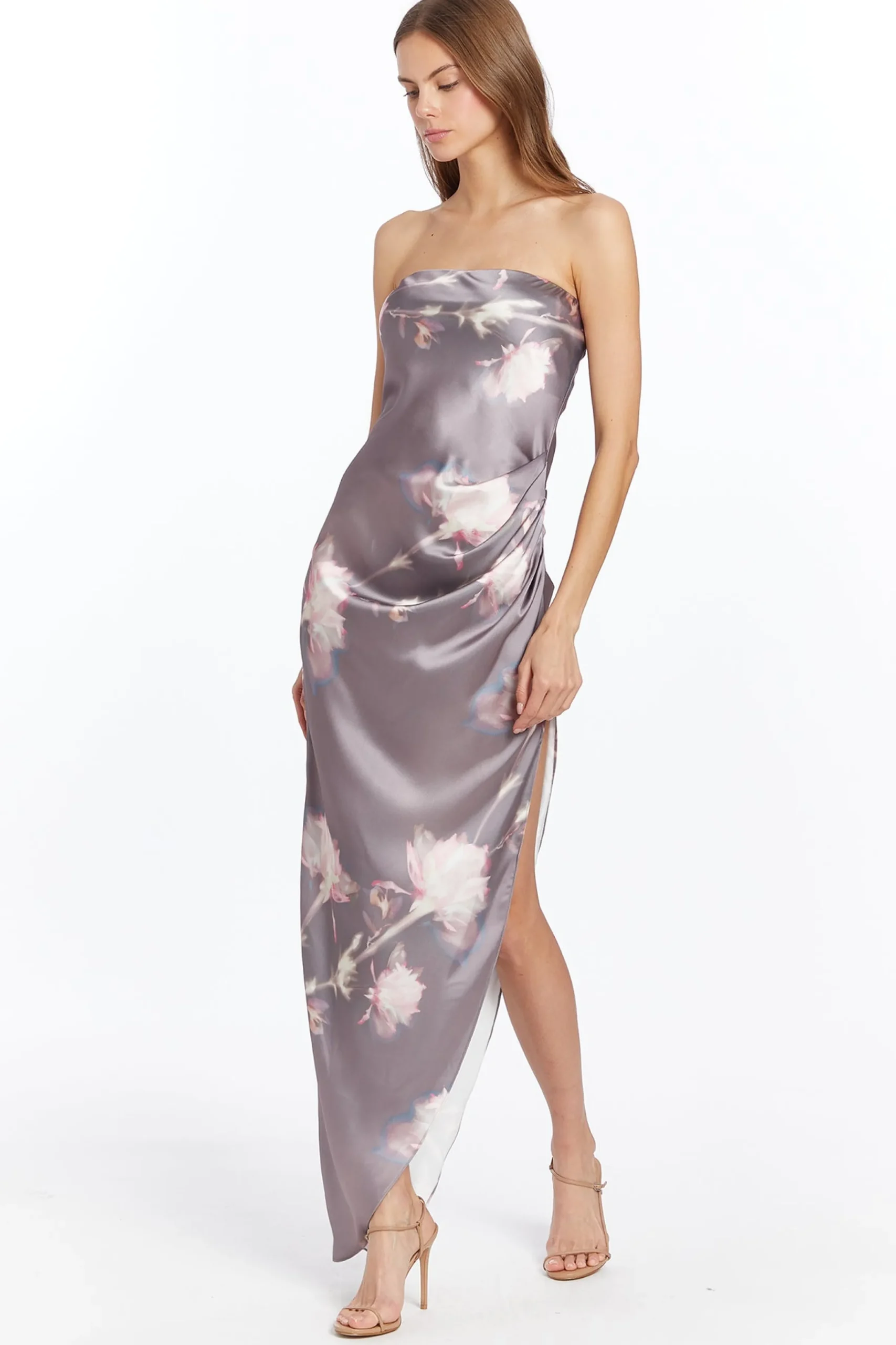 Elevate your evening with the Janae. Crafted from luscious shimmering silk in a captivating floral print, this strapless asymmetrical bias-cut maxi dress naturally shapes to your figure, falling gracefully to your curves. Ruching details at the side seams and a high leg slit make for an incredibly seductive silhouette. The Janae Dress is your go-to for a head-turning, unforgettable look.