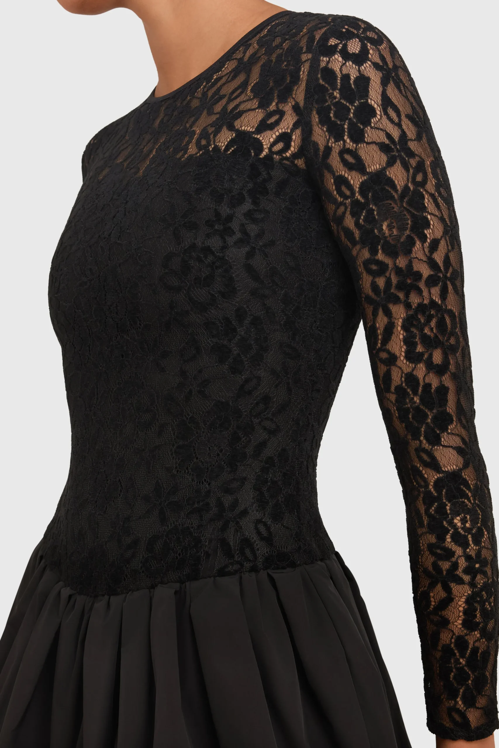 Own the night in the Lacey Skort Romper, your all-in-one piece for a bold look. Featuring a sultry black lace top with sheer long sleeves and a playful bubble skirt, this mini-length romper creates a striking contrast between flirty and elegant. Whether you’re making an entrance or hitting the dance floor, this romper ensures you stand out in style.