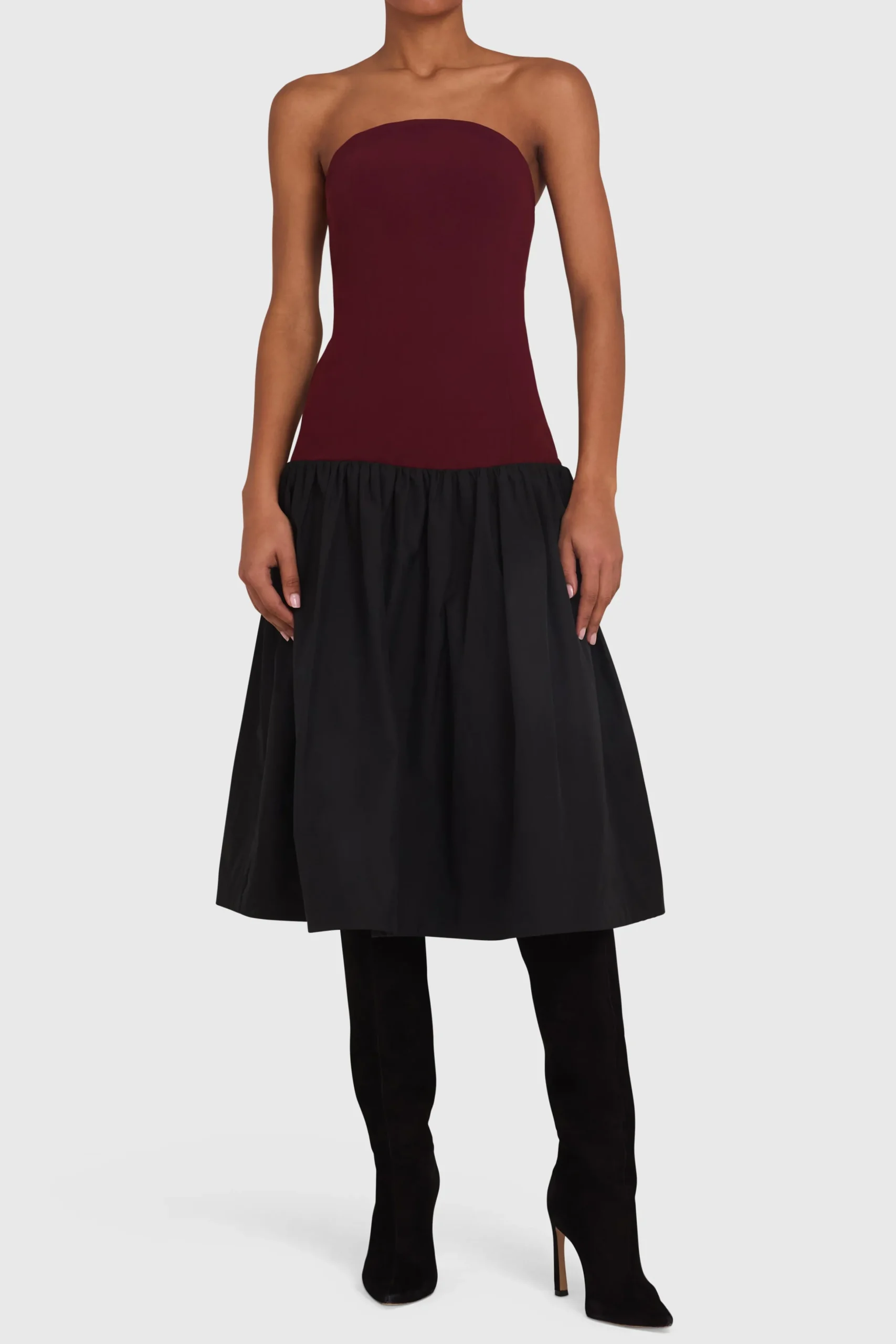 Make tonight count in the Valencia Dress, a sleek piece that’s designed to turn heads. This strapless midi features a contemporary drop waist that flows into a voluminous gathered skirt. Complement the neckline with a delicate necklace and finish with sleek heels to finish the look.
